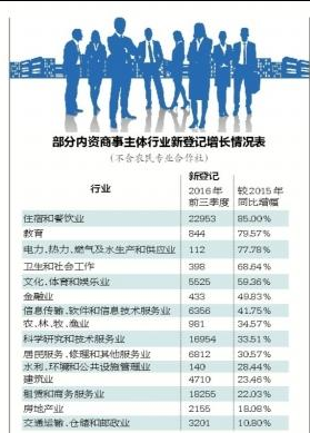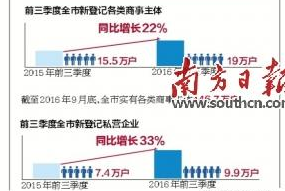 數(shù)據(jù)顯示,前三季度,全市新登記各類商事主體19萬戶,同比增長(zhǎng)22%,新登記商事主體增速為近兩年來最高。截至2016年9月底,全市實(shí)有各類商事主體146.7萬戶,高出全國(guó)平均增速8個(gè)百分點(diǎn)!